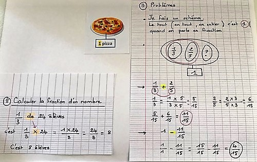 - Un autre rappel encore difficile à faire « accepter » : quand « on parle en fraction » d’un tout , le tout vaut 1 [on va essayer de passer par un tout » la pizza » , qui me semble bien parlant ! ]