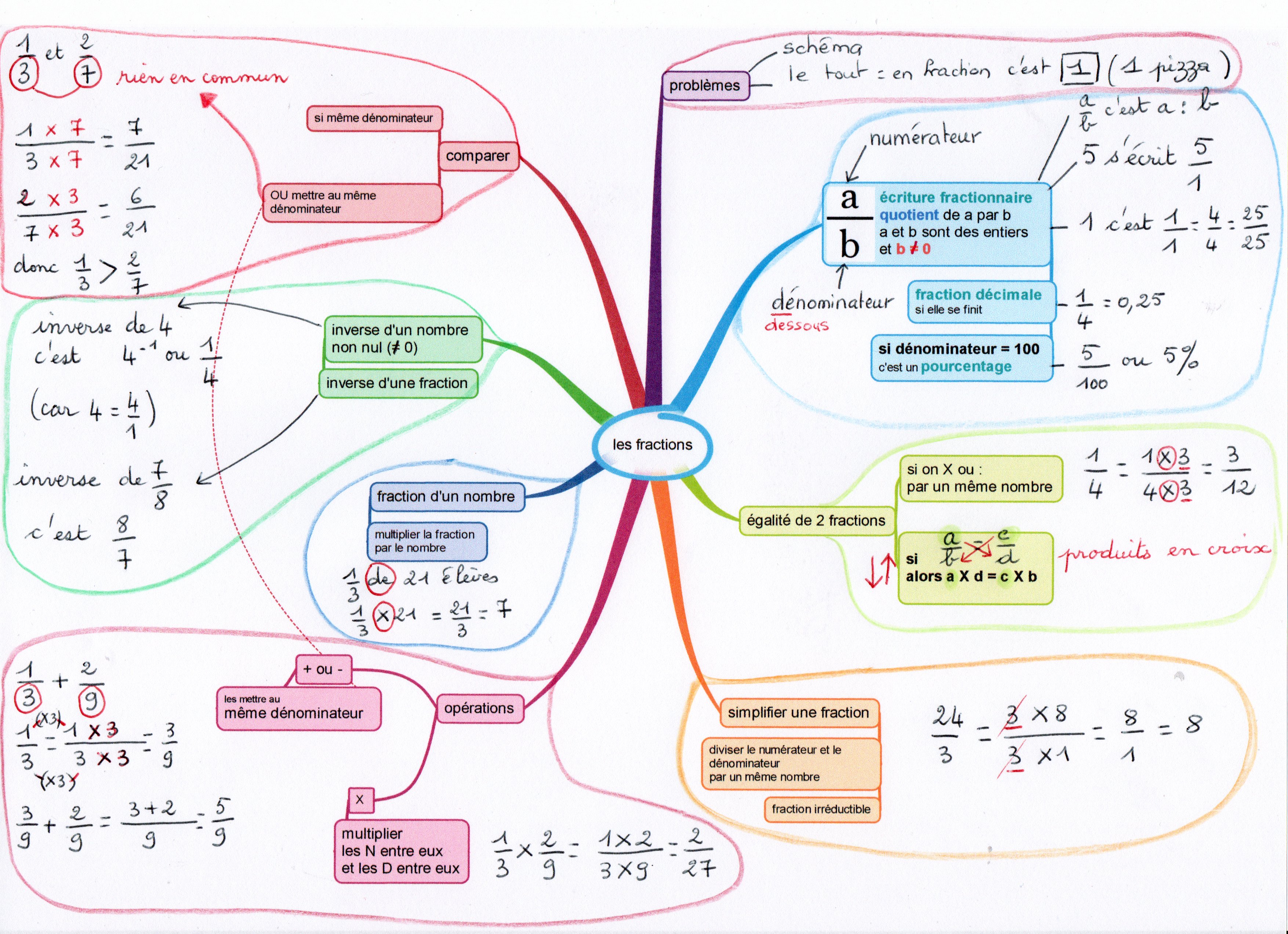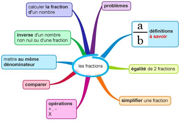 Beaucoup d’exercices et problèmes sur les fractions et beaucoup de « choses » à savoir sur cette écriture fractionnaire ….. Un essai de mise au point : vocabulaire et méthode à partir d’une carte mentale qui servira de base et que l’on transformera en « livret » avec des exemples et méthodes ( à faire choisir et écrire à Léo).
