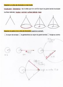 Dessiner « à main levée » des figures géométriques reste une tâche très compliquée pour Léo et, en révisant pour un DS à venir, je lui ai proposé de dessiner un cône de révolution à main levée ….. Réaction et demande : « montre-moi un cône de révolution » comme si aucune « image » ne lui venait à l’esprit pourrait-on penser . En fait c’était plutôt « comment je m’y prends pour le dessiner ? par quoi je commence … »