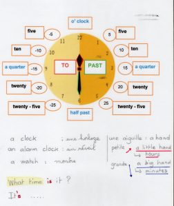 Léo a très bien compris le système des heures en anglais . Mais en français , il ne les dit pas avec « les moins » ( il ne dit pas 6h -25 mais 5h35 ) . Il a donc fallu travailler sur l’heure en anglais (il y a déjà pas mal de temps , au 1er trimestre) en tenant compte de cette difficulté (ou du moins de cette particularité…..) .