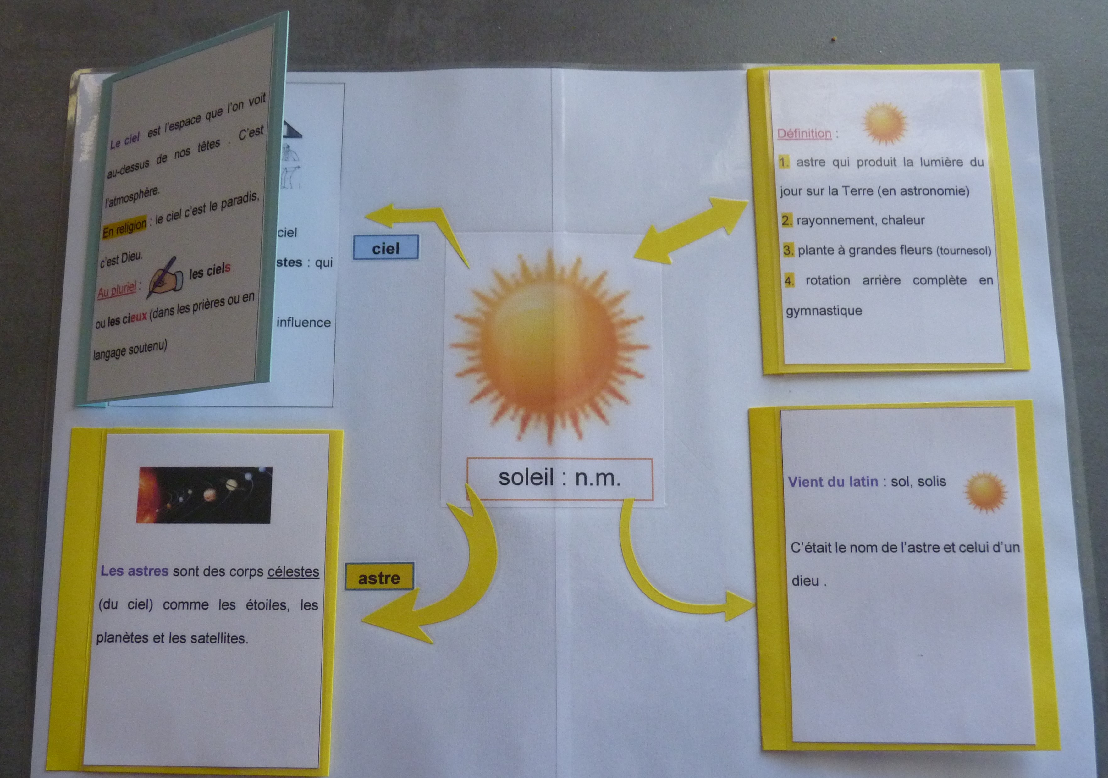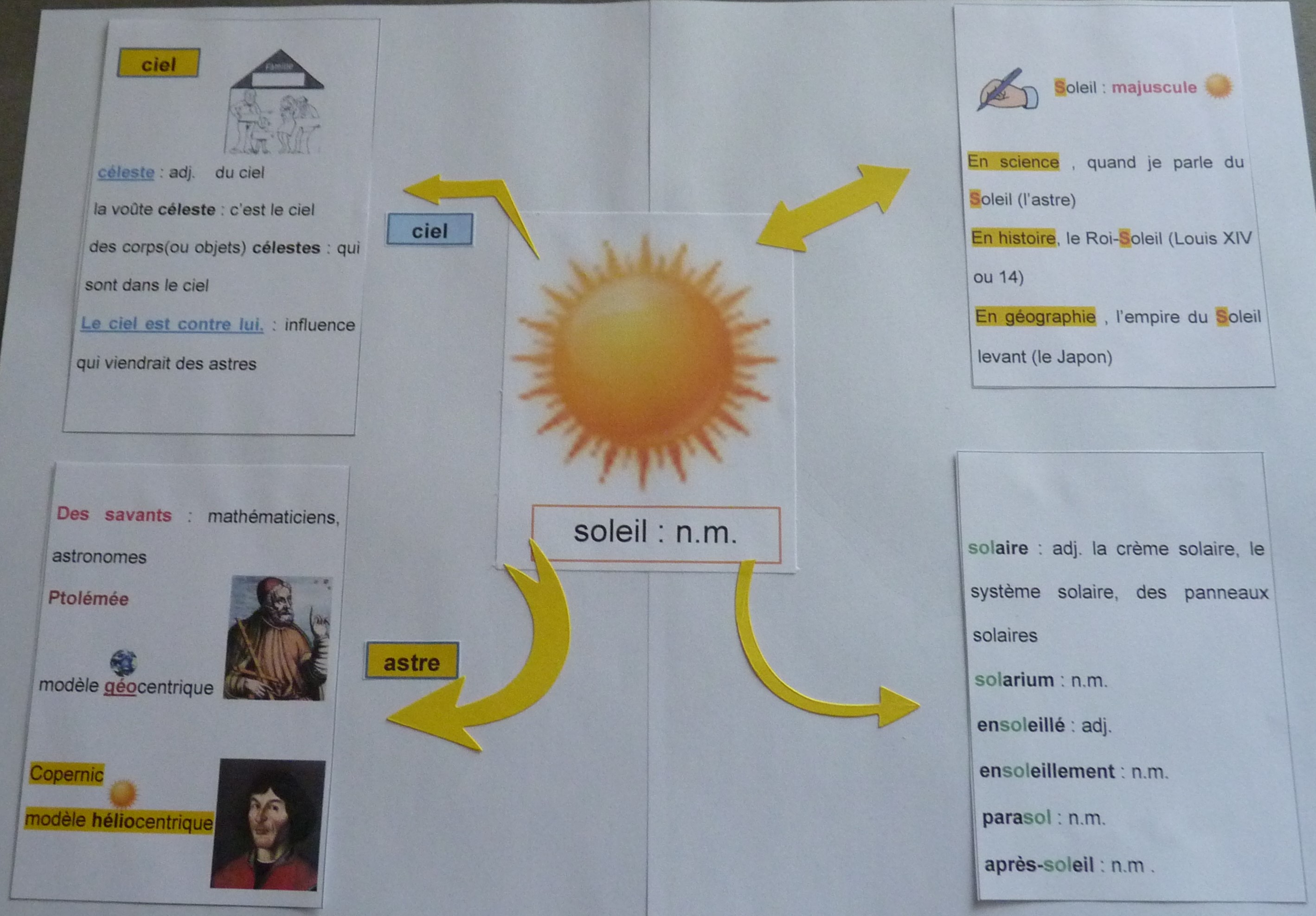 - 1ère branche : les différents sens du mot (définition), puis , ici, une précision « en astronomie » et enfin une remarque orthographique : le Soleil : quand l’écrit-on avec une majuscule ?