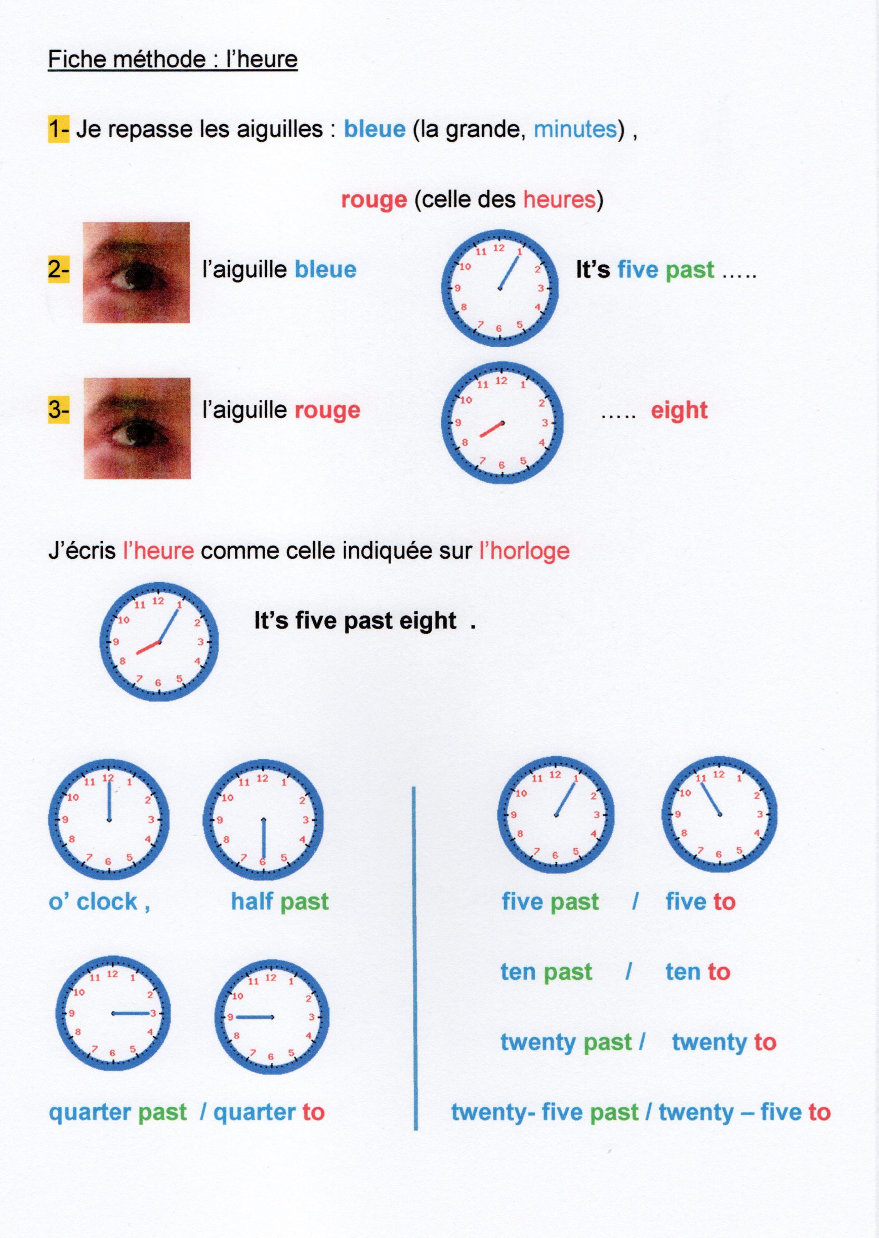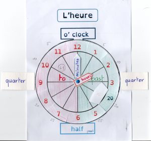 Léo a très bien compris le système des heures en anglais . Mais en français , il ne les dit pas avec « les moins » ( il ne dit pas 6h -25 mais 5h35 ) . Il a donc fallu travailler sur l’heure en anglais (il y a déjà pas mal de temps , au 1er trimestre) en tenant compte de cette difficulté (ou du moins de cette particularité…..) .