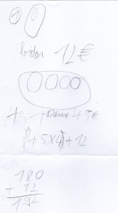 Aujourd’hui il est passé par le « dessin/schéma » ( si on peut appeler ainsi sa manière de transcrire sa réflexion) ( ce qui m’inquiète un peu …. surtout lorsqu’il veut représenter les quantités ). J’ai d’ailleurs constaté qu’en presque toutes les disciplines, il demande de plus en plus de « dessins », « d’images » pour illustrer / comprendre (donc aussi pour mémoriser : on en parlera dans un prochain article « mémoriser la leçon d’anglais »), sans doute un « facilitateur » pour lui . En résolution de problème ,cette voie est encore à explorer ….. [celle-ci ayant été délaissée jusqu’à présent car c’était plutôt une source d’erreur ,d’autant plus grande que le dessin ne venait pas de lui (dyspraxie/dysgraphie) , était proposé/imposé, sans vraiment correspondre à l’image qu’il se faisait de la situation ni à sa réflexion] .