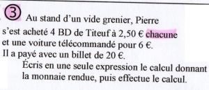 Jusqu’à présent pour résoudre un problème avec une seule expression numérique, nous nous sommes appuyés sur la démarche de résolution de problème : on résoud le problème de manière « classique » puis on résume les calculs en un seul (ou plutôt une seule expression numérique). Ce qui donne :