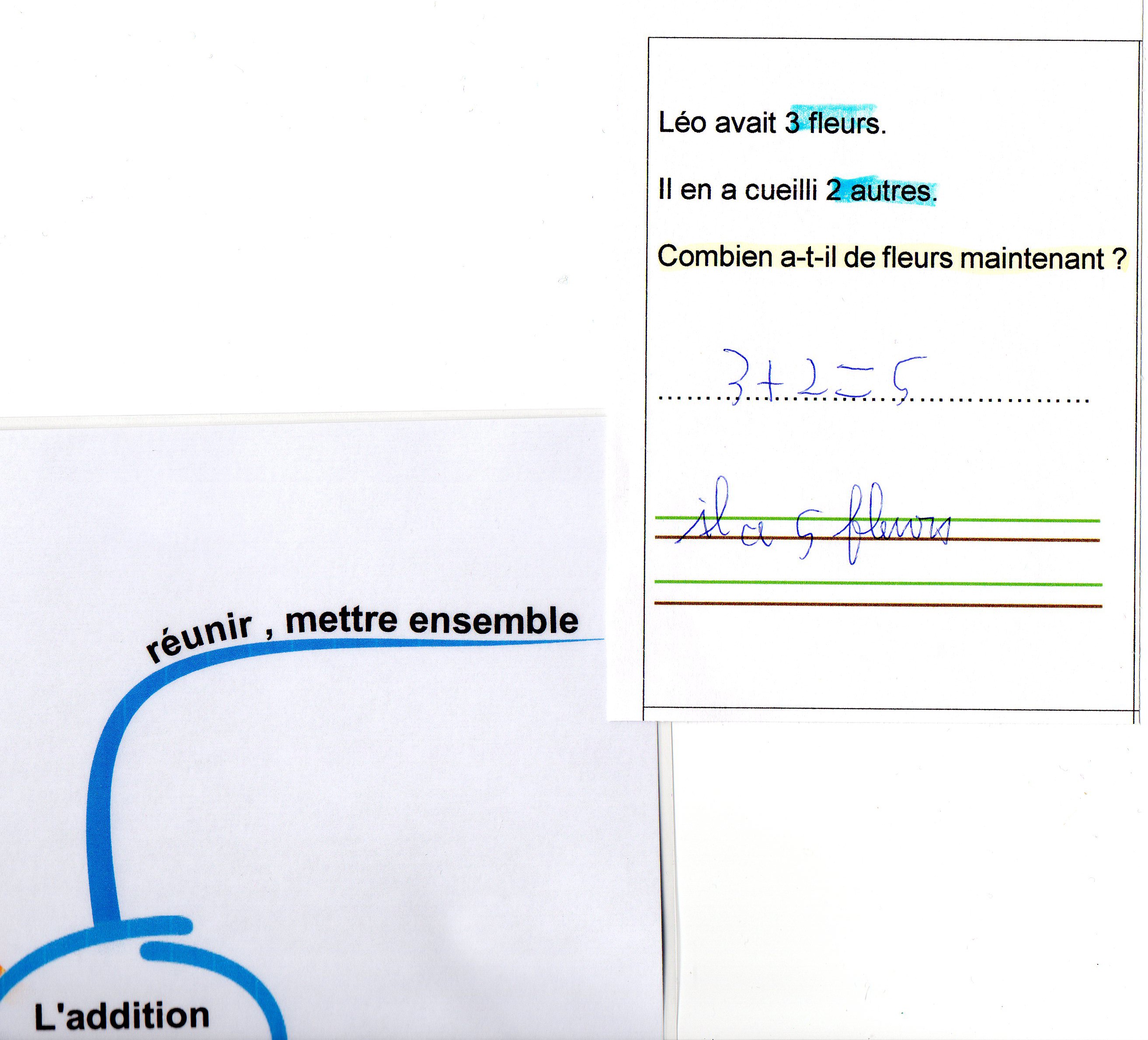 Ce n’est pas encore parfait . Néanmoins, nous sommes dans une démarche qui est entrain de se mettre en place et qui semble bien convenir à Léo : plus intuitive, plus rapide, plus synthétique, moins consommatrice d’attention (moins d’écriture aussi) ET SURTOUT, c’est une démarche qui est venue de lui …. Je l’ai senti aussi « détendu / satisfait » sur ce travail comme si c’était « plus facile ».