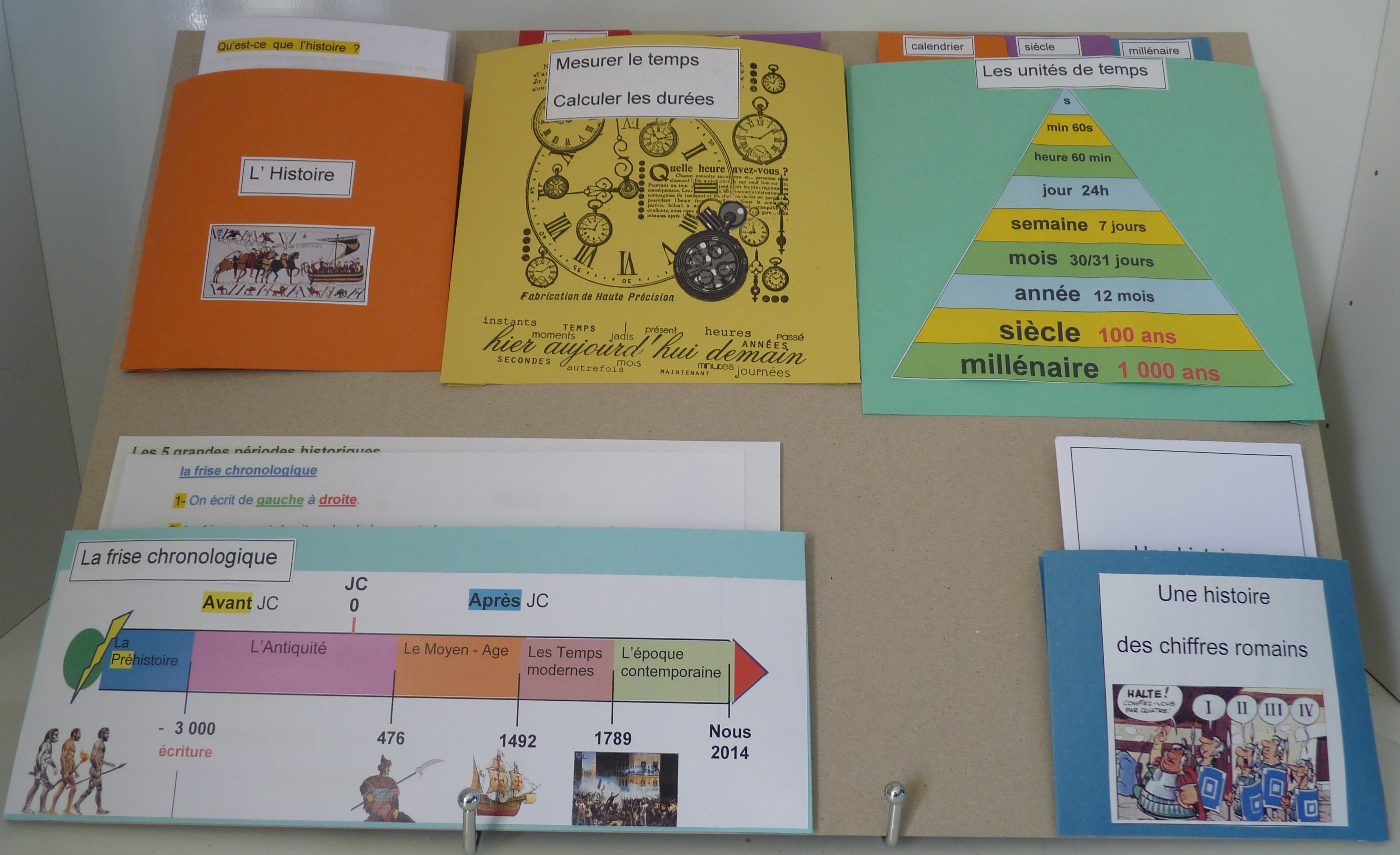 Certaines sont plastifiées ( notamment la pochette des frises car elles vont le plus souvent être sorties et manipulées, d’autres frises seront rangées au fur et à mesure …). Panneau à alimenter selon les besoins .Pour l’instant nous l’avons observé et Léo a lu tous les documents. Quelques termes sont encore à éclaircir ….. et quelques petits entraînements seront nécessaires (devinettes, questions, travail sur les dates , les siècles ….) avec le panneau sous les yeux tant que ce sera nécessaire et d’autres fois en le cachant !