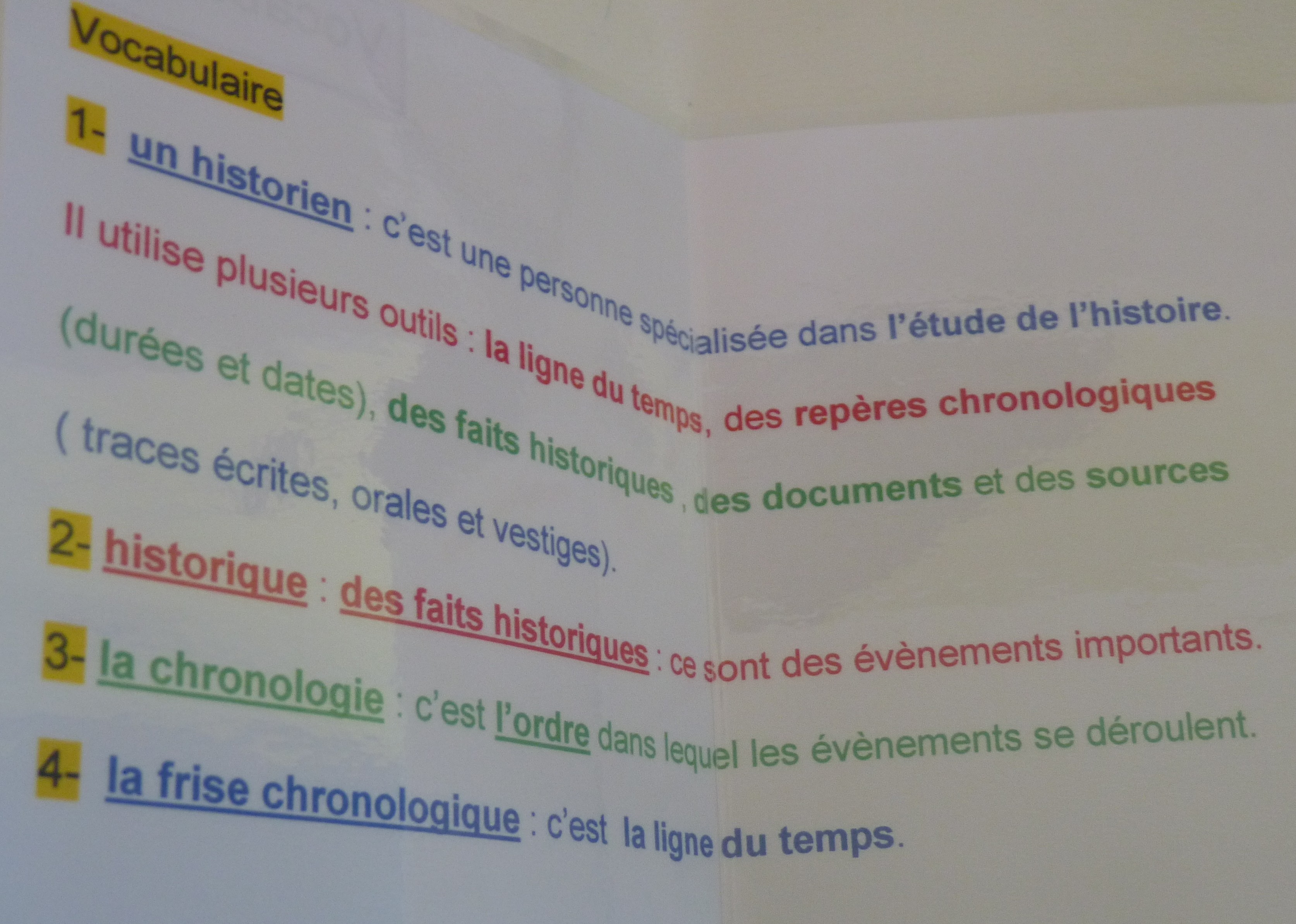 - La frise chronologique avec à l’intérieur 2 fiches plastifiées : définition et frise des 5 grandes périodes historiques