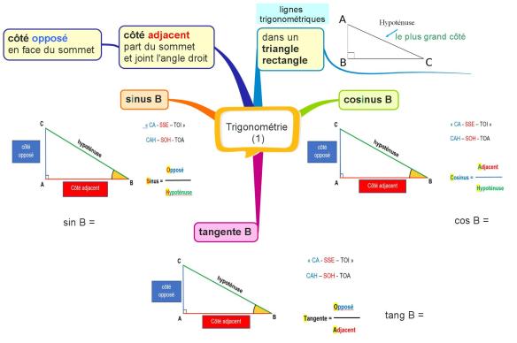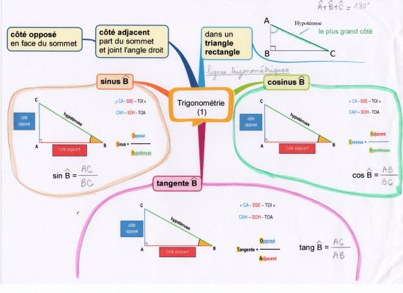 Notions résumées dans la carte mentale ci-dessous Trigonométrie 1 ( la 1ère est celle faite avec IMINDMAP et la 2ème avec quelques ajouts … on verra si on la modifie selon l’avancée de la leçon). Nous avons dû reprendre ces notions plusieurs fois ….